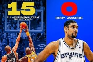邓肯生涯15次入选最佳防守阵容,但从未拿过年度最佳防守球员,本-华莱士拿过4次。