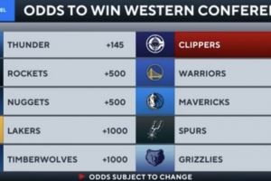 下赛季西部冠军赔率:雷霆+145 火箭&掘金+500 湖&狼&船+1000