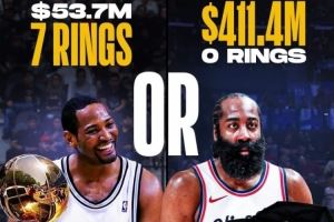 詹姆斯-哈登的(薪资)收入已经超过了4.11亿美元,但NBA生涯至今冠军数仍是0。
