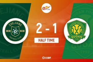 上半场伤停补时6分钟,半场结束,浙江暂2-1北京国安。