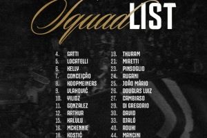 4-加蒂、5-洛卡特利、6-凯利、7-小孔塞桑、8-库普梅纳斯、9-弗拉霍维奇、10-伊尔迪兹、11-冈萨雷斯、12-阿图尔、15-卡卢卢、16-麦肯尼、18-科斯蒂奇、19-K-图拉姆、21-米雷蒂、23-平索里奥、24-鲁加尼、25-若昂-马里奥、26-道格拉斯-路易斯、27-坎比亚索、29-迪格雷戈里奥、30-戴维、33-贾洛、40-鲁希、44-托马索-曼奇尼、45-温特