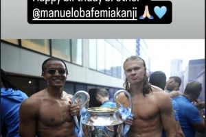 哈兰德社交媒体上晒出与阿坎吉共同手持大耳朵杯的照片,两人赤裸上身,肌肉相当炸裂。哈兰德配文写道:生日快乐,兄弟