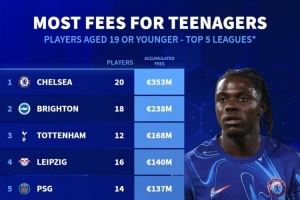 21-22赛季以来引进U19转会费榜:切尔西3.53亿欧居首,布莱顿次席
