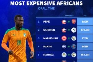 德转统计历史非洲转会费最贵球员:佩佩加盟阿森纳8000万欧居首