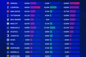 体育资讯09月05日讯 德转统计了大俱乐部的夏窗净投入排行,枪手2.84亿居首,红军第2,曼联第3。