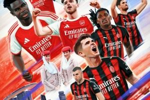 今日阿森纳官方社媒发布季前赛对阵AC米兰的海报,海报中枪手萨卡、厄德高、赖斯 VS 米兰普利西奇、莱奥等球员。
