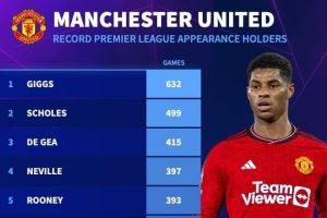 已效力9年!拉什福德为曼联出战287场英超,位列队史第10位