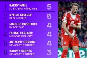 本赛季欧冠进球榜:凯恩姆巴佩5球列前二,哈兰德拉师傅等人4球