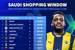 各队向沙特卖人收入榜:维拉1.37亿欧居首,波尔图巴黎二三位