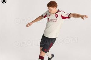利物浦新赛季客场球衣由阿迪达斯设计生产,球衣主体为奶油白色,搭配红色Logo和黑色点缀。